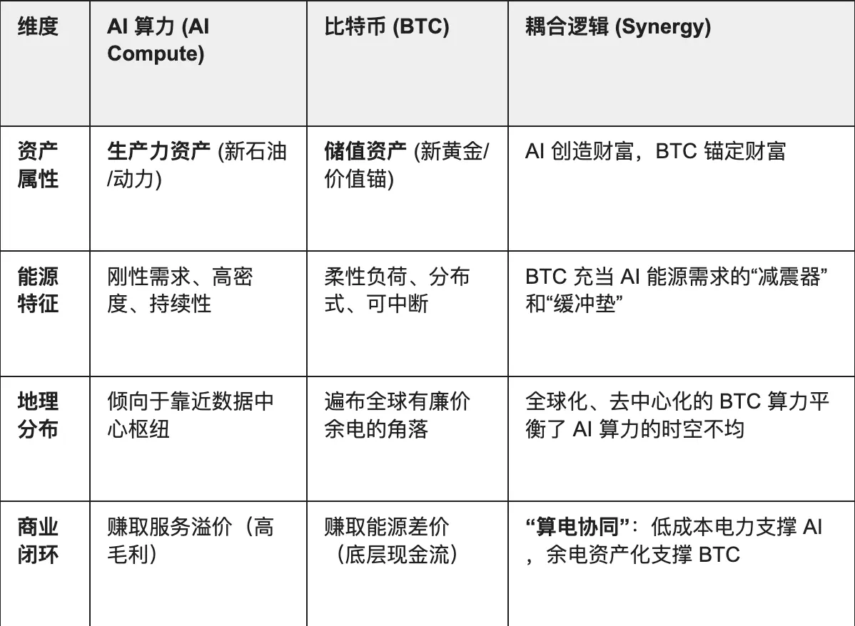 次に、AI計算能力は、消費性の生産資産として、そのコアコストは電力に由来し、価値の産出はアルゴリズムの効率性に依存する。一方、BTCは分散型の価値保存資産として、エネルギーの貨幣化の表現であり、グローバルな計算能力の時空間の不均衡をバランスさせる「貯水池」機能を天然で備えている。AIは安定した電力供給を必要とし、BTCのマイニングは、電力網の余剰電力(風力・太陽光のピーク時など)を消化できる。つまり、BTCのマイニングは「需要応答(Demand Response)」を通じて電力網を安定させる:電力過剰時(風力・太陽光ピーク時)には、計算能力が余剰電力を吸収し、電力不足時(AI計算ピーク時)には、マイニングの計算能力を瞬時に停止し、より高価値なAIクラスターに電力を供給できる。