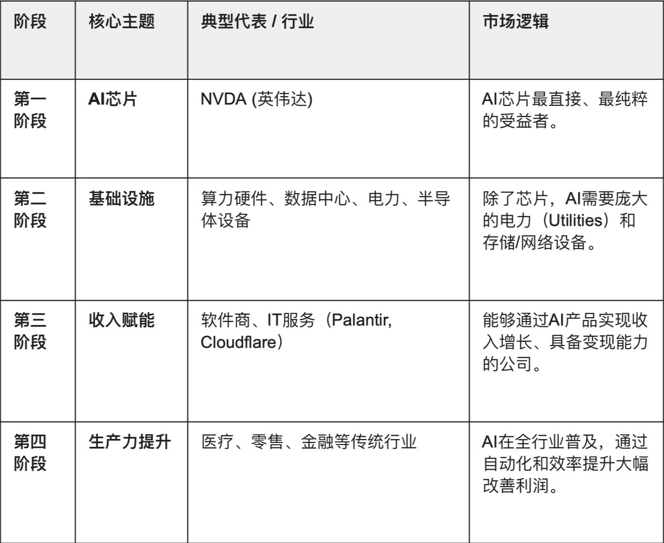 したがって、今後2〜3年の市場の焦点は、単一のテック巨頭だけにとどまらず、より広範囲に拡大していく:AIインフラ(電力、計算ハードウェア、データセンター)を深掘りし、AIを収益増に変換できる多産業企業を探すことになる。