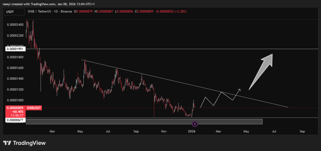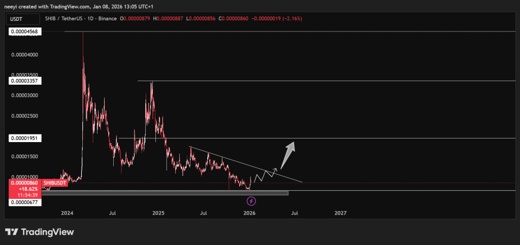 一つのシナリオは、SHIBが下降トレンドラインを突破し、長期の統合フェーズに入ることです。価格は$0.00000667から$0.00001951の間で回転しながら、勢いをゆっくりと築く可能性があります。