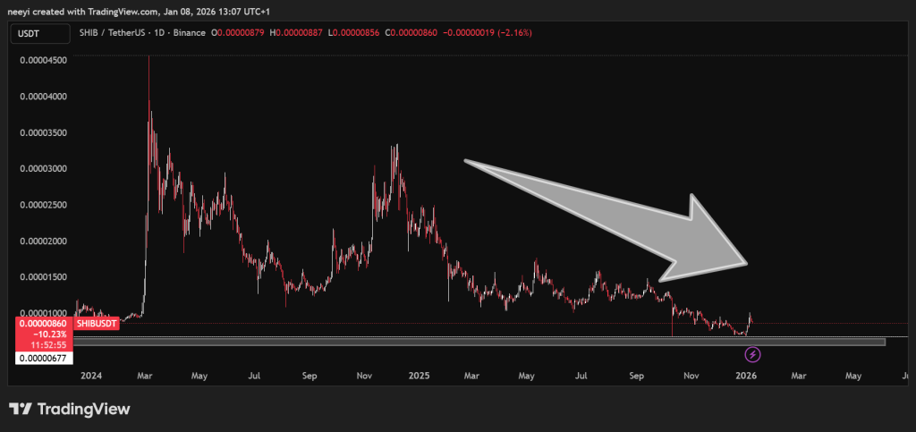 シバイヌの価格は、長く不安定な下落の後、徐々に会話に戻りつつあります。かつてミームコインのピーク時に繁栄したトークンは、2025年の大部分を圧力の下に過ごし、2024年11月の高値から70%以上失いました。価格の弱さは数ヶ月間持続しましたが、$0.0000067付近で何かが変わりました。