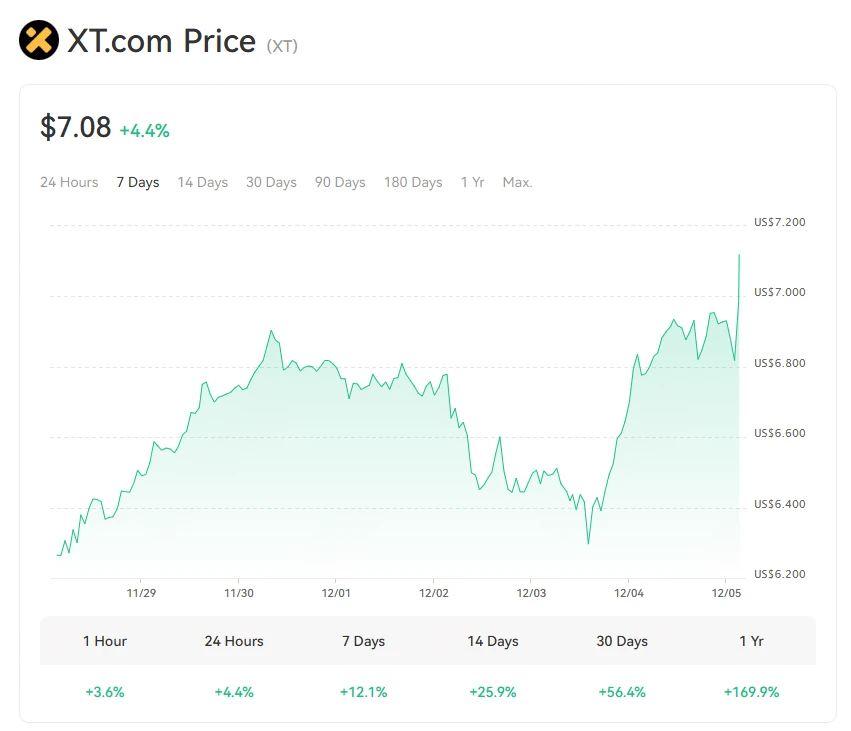 2024年11月、XT.COMは画期的な時点を迎えました-そのネイティブトークンであるXTの価格が初めて7ドルを突破しました。この重要なマイルストーンは、XTトークン自体の価値だけでなく、XT.COMプラットフォーム全体の実力と将来の潜在力に対する市場の高い評価でもあります。この突破は、XTトークンが暗号生態系の中核資産としての重要性を示し、XT.COMの業界での革新力とリーダーシップの地位を強調しています。