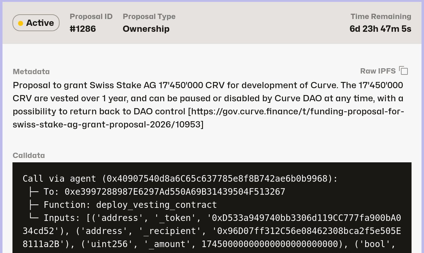 Swiss Stake AGは、年間で17,450,000 CRVトークン(約CHF 530万)の助成金を申請しており、資金はソフトウェア開発、研究、インフラ、エコシステム支援に限定して配分されます。未使用の資金は次年度に繰り越され、すべてのCRVトークンは承認された流動性プロジェクトにステーキングされ、得られる収益はプロジェクトに再投資されます。同社は四半期ごとにCurveコミュニティに進捗報告を行い、透明性と説明責任を確保します。