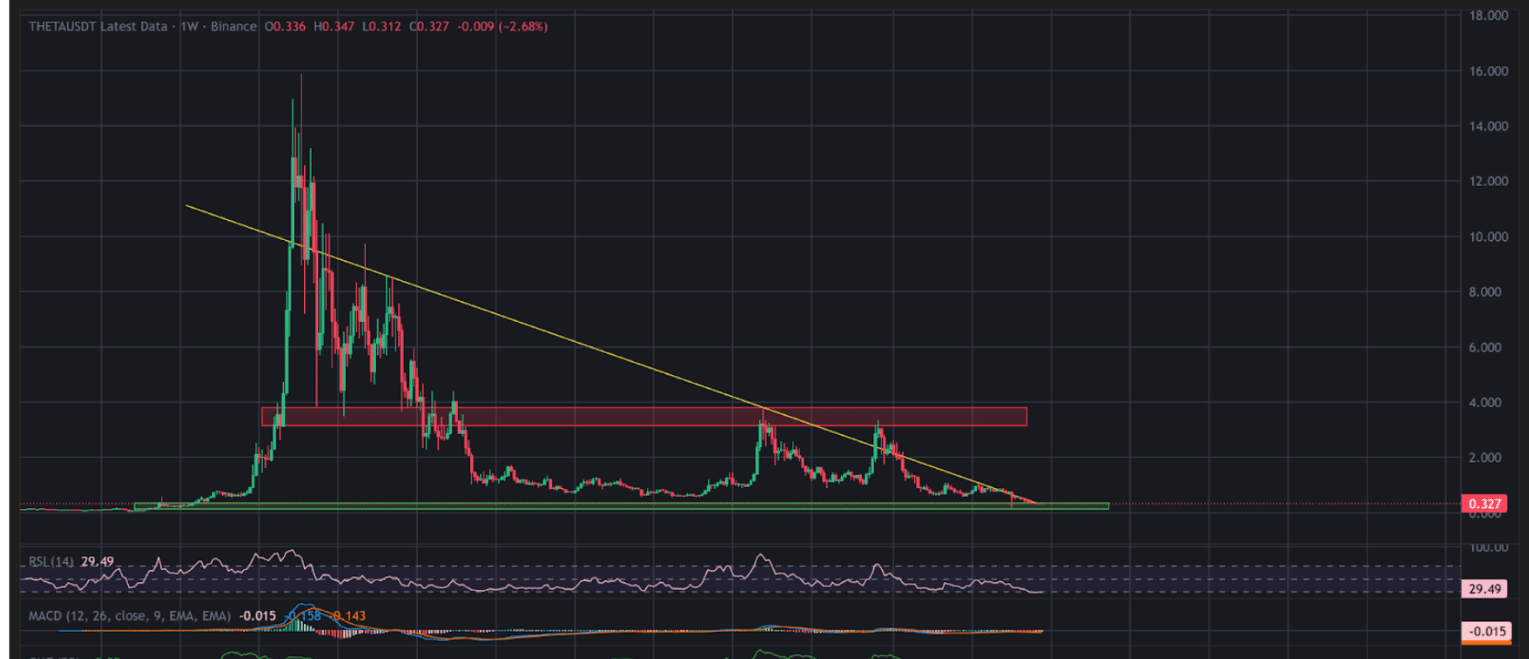 2020年後半から2022年初頭の短期間のラリーにもかかわらず、THETAは$0.3278で取引されており、史上最高値の15ドル超から97.95%下落しています。このアルトコインは過去30日間で21%の大幅な下落を記録しています。