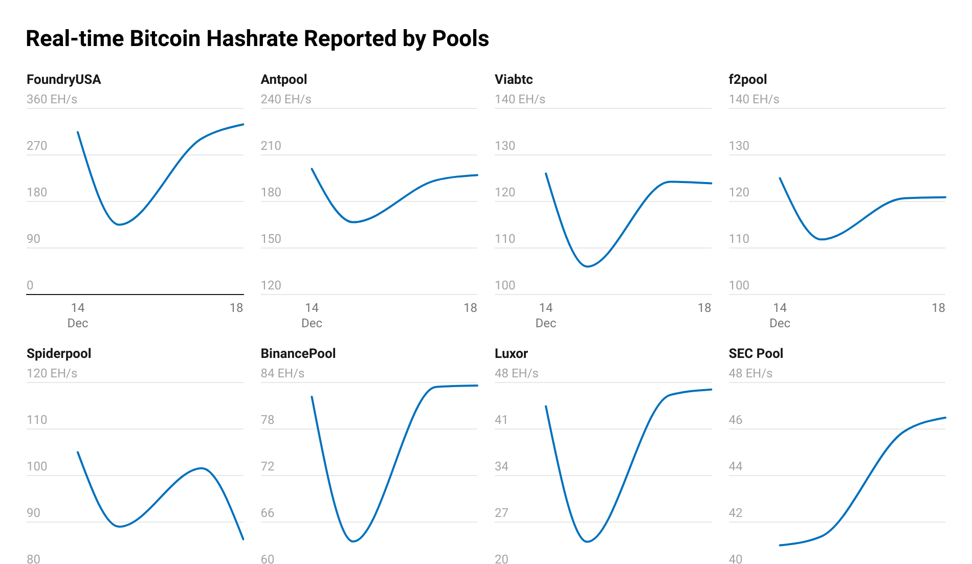 TheMinerMagのデータによると、月曜日の混乱中に最大のプールレベルの低下は北米から発生し、Foundry USAだけで約180EH/sのハッシュレート低下を報告しました。