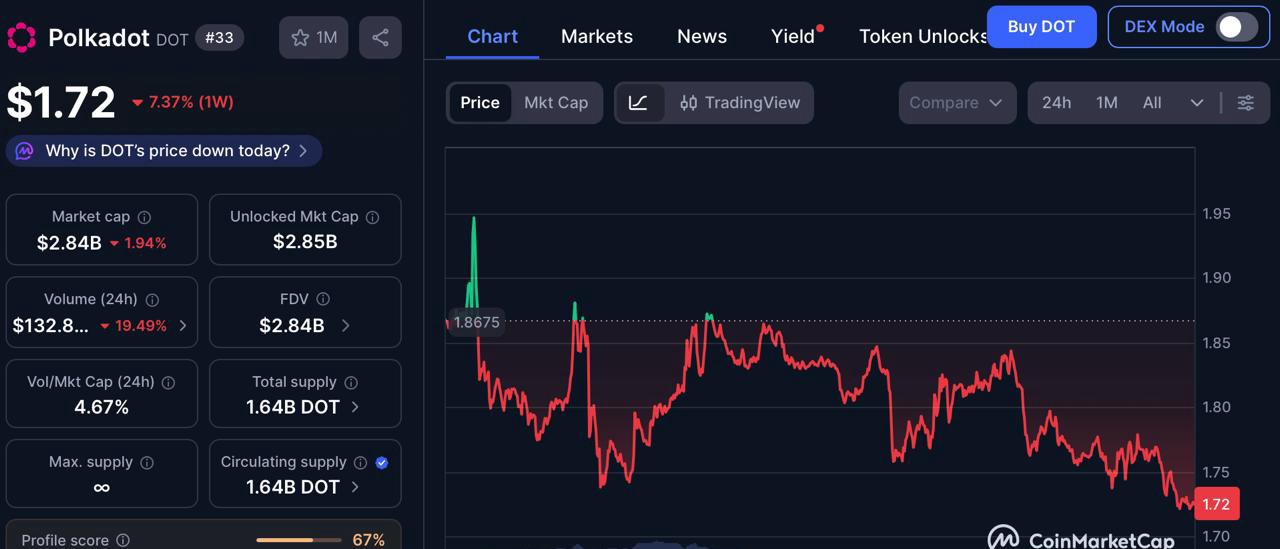 過去7日間で、Polkadotは7%以上下落し、$1.85–$1.87の抵抗ゾーンを突破できずに短期的な弱気構造を拡大しています。チャートは複数の安値を更新した後の急激な下落を示し、価格は$1.70–$1.72のサポートエリアに向かって滑り落ちており、売り圧力は緩和し始めています。
