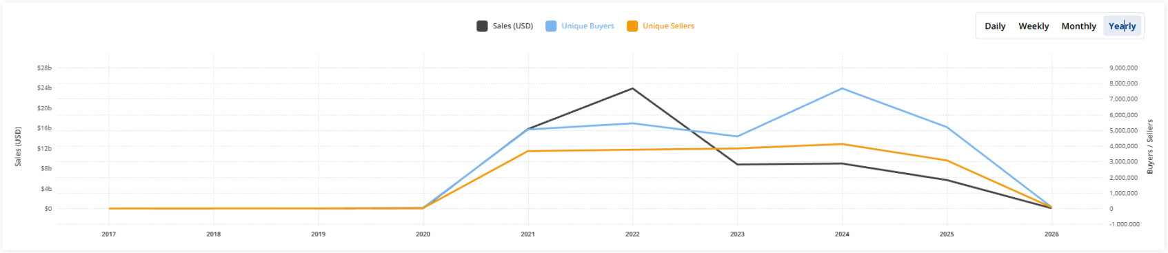 供給過剰。CryptoSlamのデータによると、2025年の供給量は2024年の10億枚に比べて35%増加し、過去4年間でNFT総量は3,800万枚から13.4億枚へと約3,400%増加した。