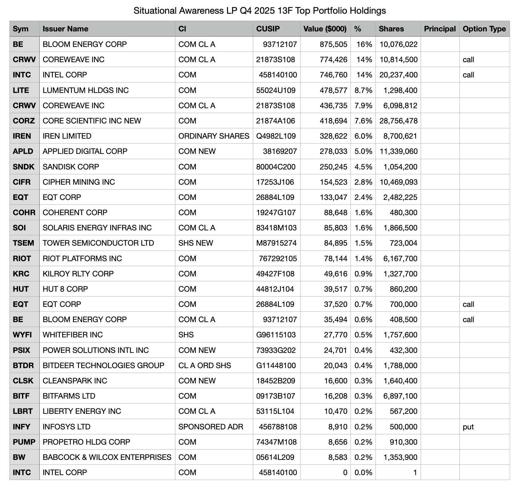 もう一つ、暗号通貨界と多少関係がありそうな手掛かりは、Situational Awareness LPの保有リストにビットコインマイニング企業の影も見える点です。具体的にはCore Scientific、Cipher Mining、Iren(旧名Iris Energy)、そして吴忌寒が率いるBitdeerなどです。