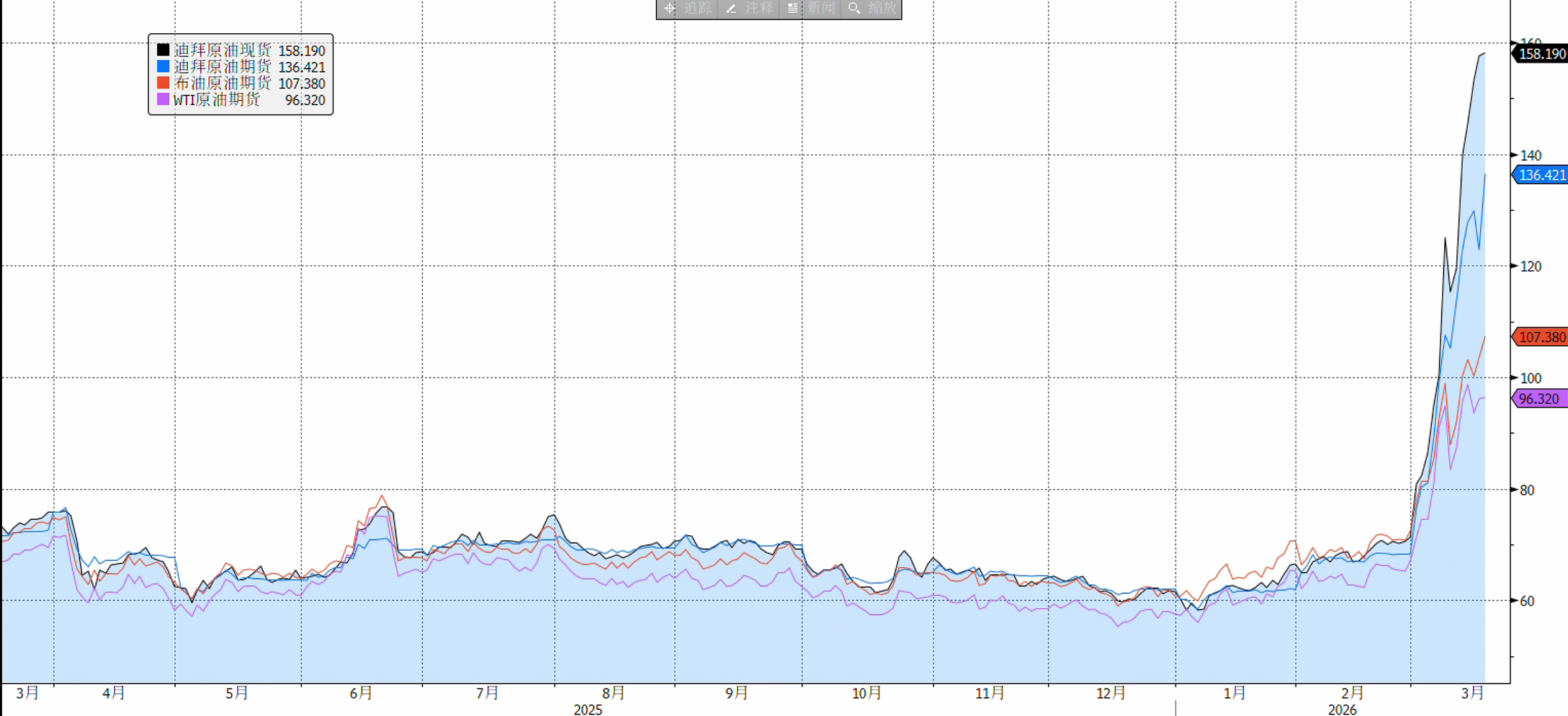実物の引き渡しを反映した中東の基準原油価格は2008年の歴史的高値を突破し、ドバイ原油の現物価格は158.19ドル/バレルに達し、オマーン原油も152.58ドル/バレルの新高値を記録している。金融取引における「紙の原油」と、実物の原油を扱う精製工場との間には、市場認識において大きな乖離が存在している。