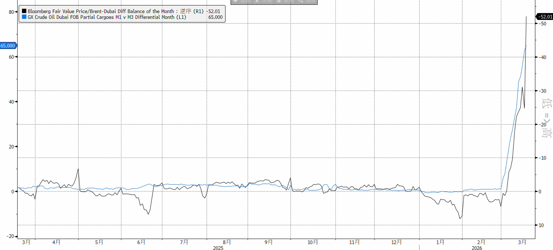 通常、ブレント原油はドバイ原油に対して一定のプレミアムまたはわずかなディスカウントを持つが、現在のドバイ原油の現物プレミアムは65.0ドル/バレルに達しており(紛争前の2月平均はわずか0.90ドル)、国際基準価格と実際の取引価格の乖離は52.0ドル/バレルに上る。これは、世界の基準油価体系が深刻な歪みを抱えていることを示している。