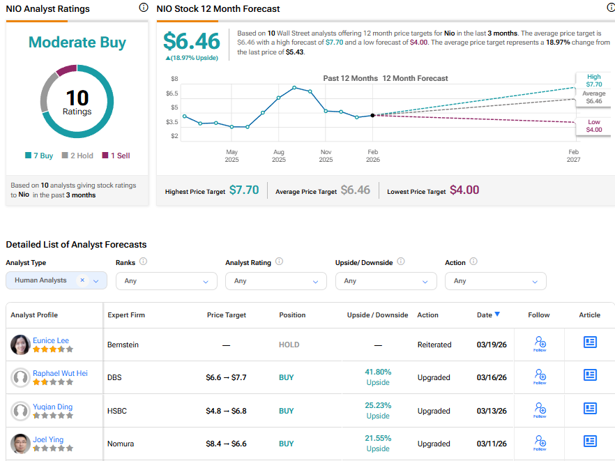 全体として、ウォール街はNIO株に対して「中立的な買い」コンセンサス評価を持っており、7件の買い推奨、2件のホールド、1件の売り推奨が出ています。平均目標株価は6.46ドルで、18.97%の上昇余地を示しています。