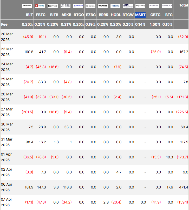 米国の現物ビットコイン ETF は 2025 年 11 月から 2026 年 2 月までの期間に、連続 4 か月にわたって純流出を経験し、累計で約 63 億ドルとなりました。3 月に反転して 13.2 億ドルの純流入を実現しましたが、第 1 四半期全体では小幅な純流出で着地しました。まさに MSBT 上場の直前である 4 月 6 日、米国のビットコイン ETF 全体は約 4.71 億ドルの単日純流入を記録し、1 か月超ぶりの最高記録となりました。
