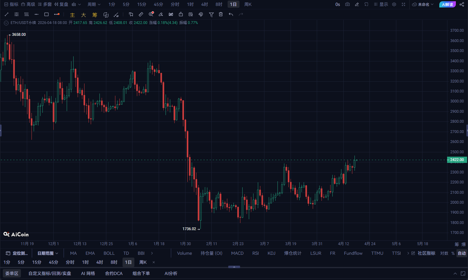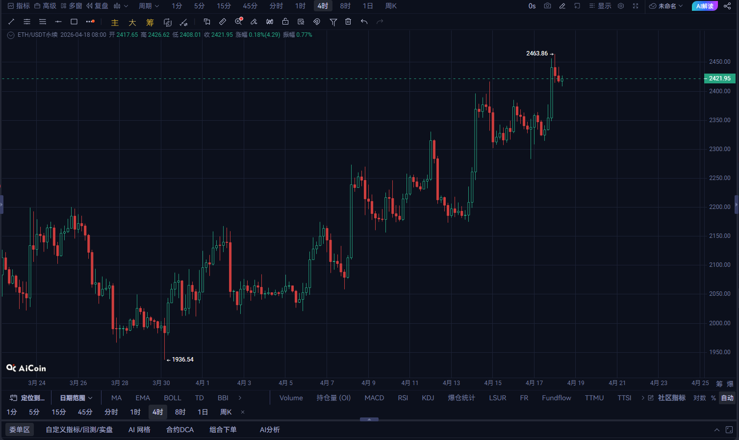 ETHの最近の相場は強い動きを見せており、一定期間の震荡整理を経て、無事に2400を突破し、2460に近い過去の高値に迫っています。現在の価格は短期的な震荡範囲内にありますが、抵抗線を突破すれば、今後の動きには依然として大きな不確定性があります。次に、日足、4時間足、1時間足の3つの周期からETHの動向を分析し、より賢明な意思決定をサポートします。