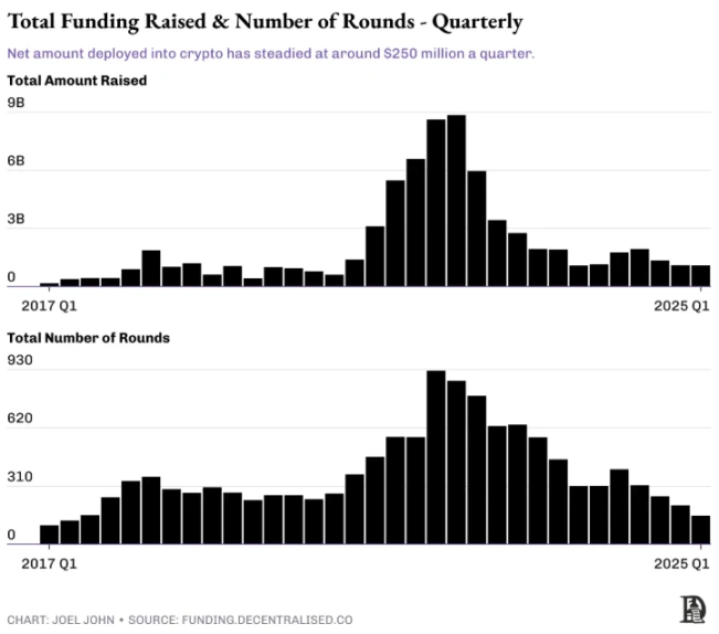 6年間、私はこれらのデータを追跡してきましたが、同じ結論に達しています:リスク資金調達はますます困難になるでしょう。市場の熱狂は最初は人材や利用可能な資本を引き寄せますが、市場の効率性によって、時間が経つにつれて物事はますます困難になることが決まっています。2018年には「ブロックチェーン」となることで資金調達ができましたが、2025年にはプロジェクトの収益性や製品と市場の適合性に焦点を当て始めます。
