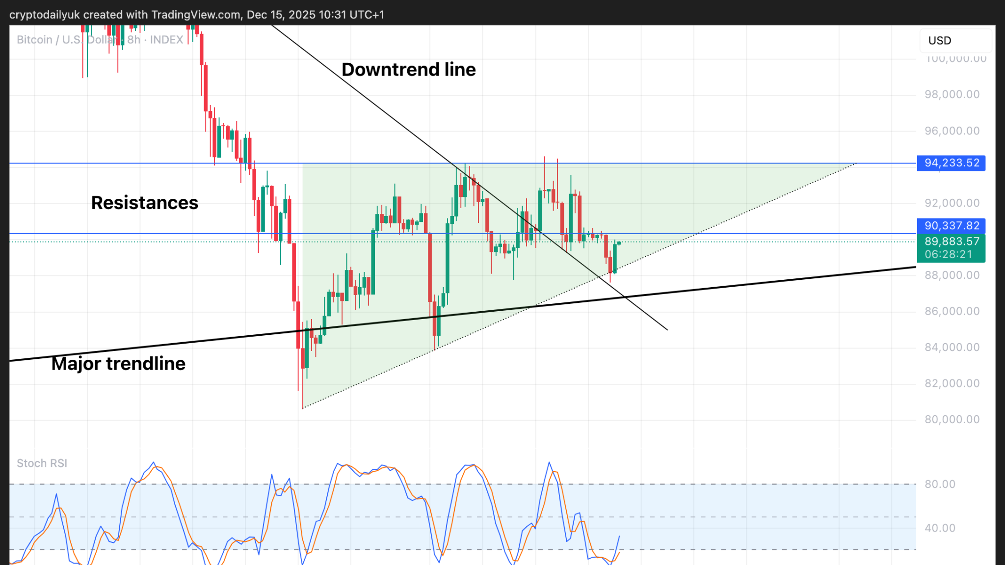 $90,000の水平抵抗線は、今回絶対に突破すべき重要なレベルです。これを突破できれば、BTC価格は$94,000の抵抗線まで引き上げられるはずです。しかし、もしこのレベルで躊躇する場合、主要な上昇トレンドラインと抵抗線の間にはわずかな余地しか残っていません。価格は一方に動く必要があり、早急に結論を出す必要があります。