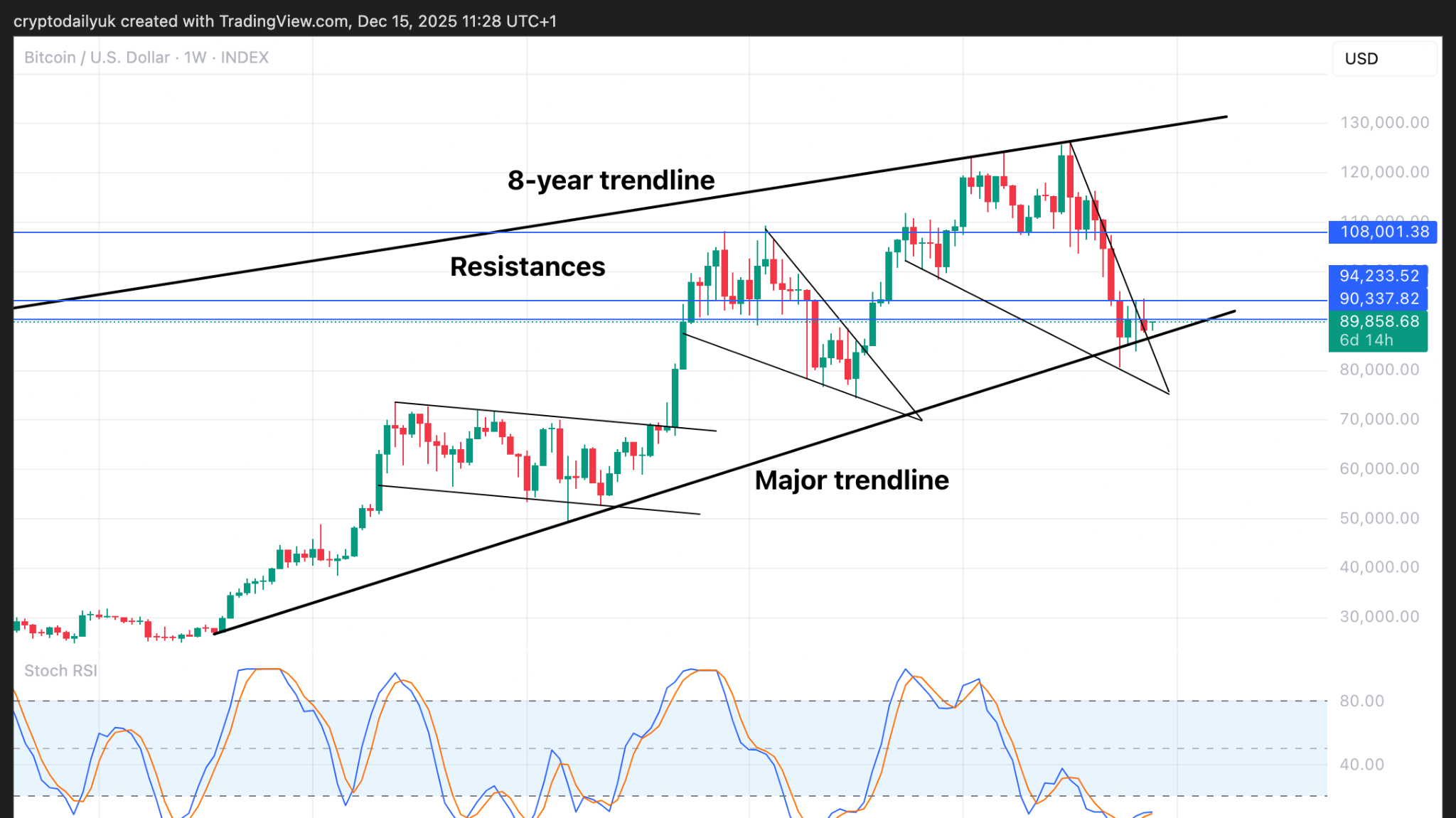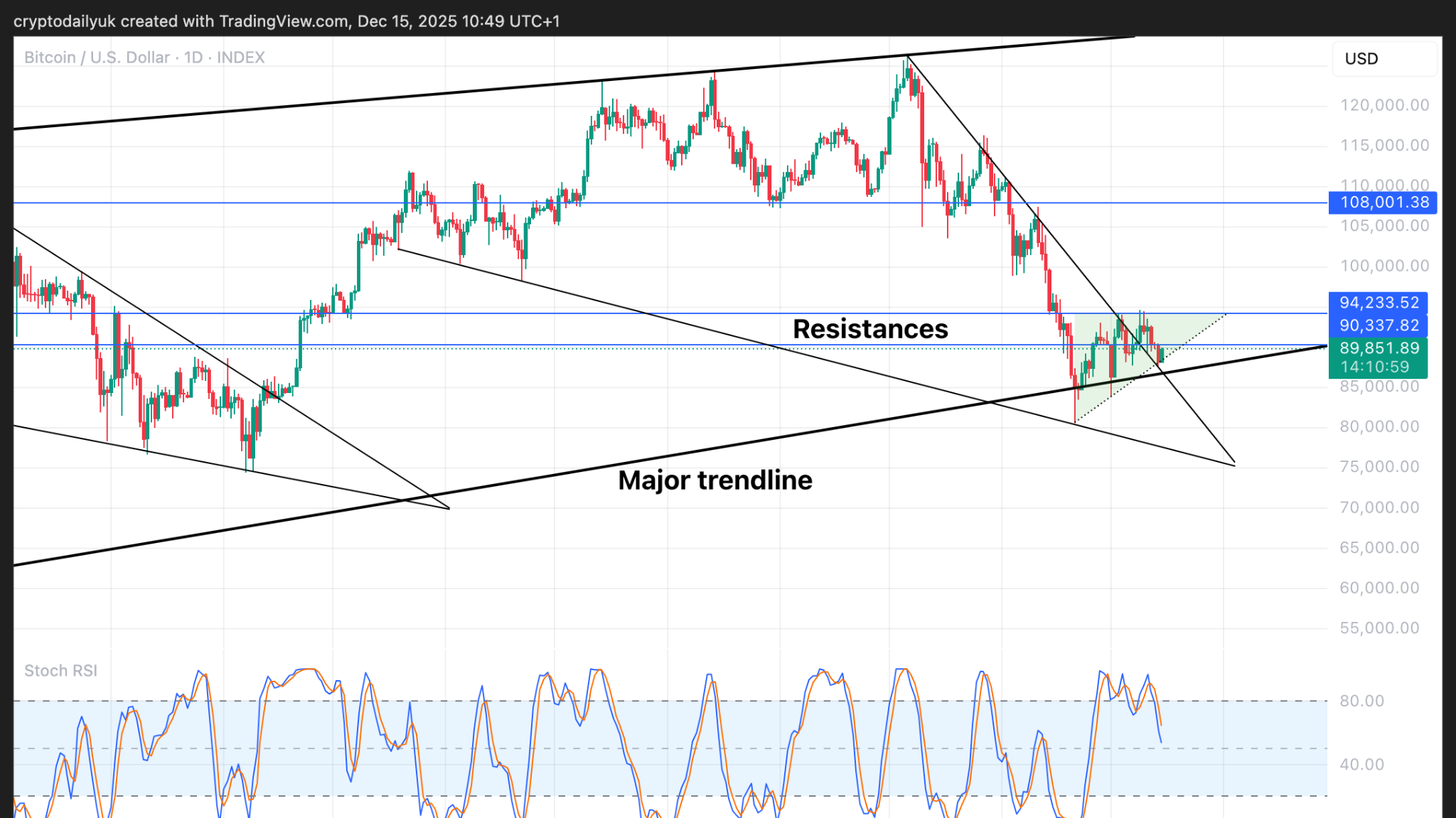 日足チャートを見ると、状況が非常に明確です。価格が主要なトレンドラインの上にとどまるかどうか、またはそうでないかによって、ビットコイン保有者にとって非常に厳しい展開となるでしょう。