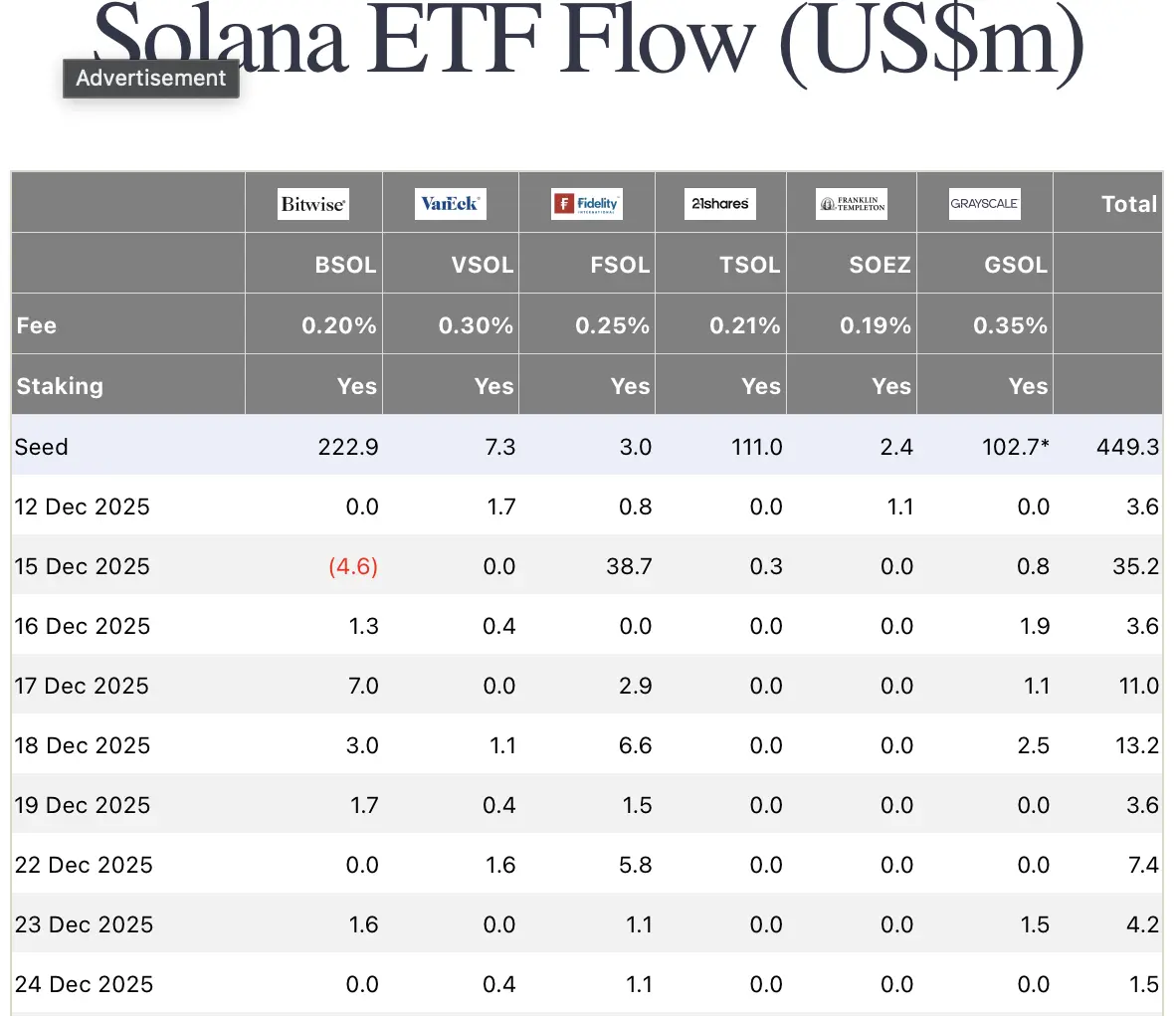 Solana-linked ETFs, while smaller in scale, continued to see steady interest. The group recorded $5.2 million in net inflows, led by major ETF providers.