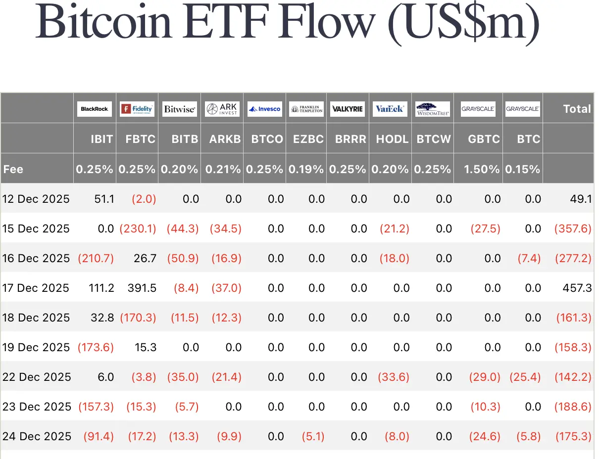 Leading investment firms’ Bitcoin ETFs drove the move with approximately $143.7 million in inflows from the largest provider, followed by another major platform at $78.6 million and a third prominent issuer with about $109.6 million. The turnaround followed weeks of uneven flows and holiday-driven outflows, suggesting renewed year-end positioning by asset managers.