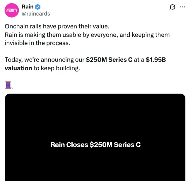 Source: CryptoNewsNet Original Title: Visa-linked stablecoin platform Rain raises $250M at $1.95B valuation Original Link: Rain, a US stablecoin infrastructure provider and a principal member of the Visa payment network, has secured major funding to expand its global presence.
