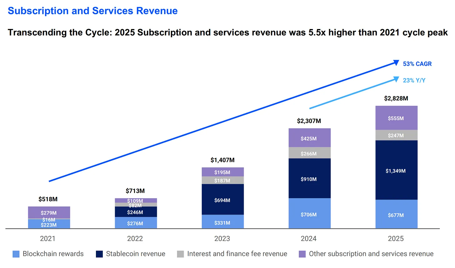 Coinbase’s subscription and services (S&S) revenue in 2025 reached $2.8 billion, a 5.5-fold increase from the peak of the 2021 cycle, and double that of 2023. This indicates Coinbase’s revenue base is continuously expanding, covering areas like stablecoins, custody, and blockchain rewards. In Q4, the value of USDC holdings on Coinbase’s platform hit a record high of $17.8 billion, up 18% quarter-over-quarter. Currently, Coinbase holds more cryptocurrencies than any other company globally, accounting for 12% of the total global crypto holdings.