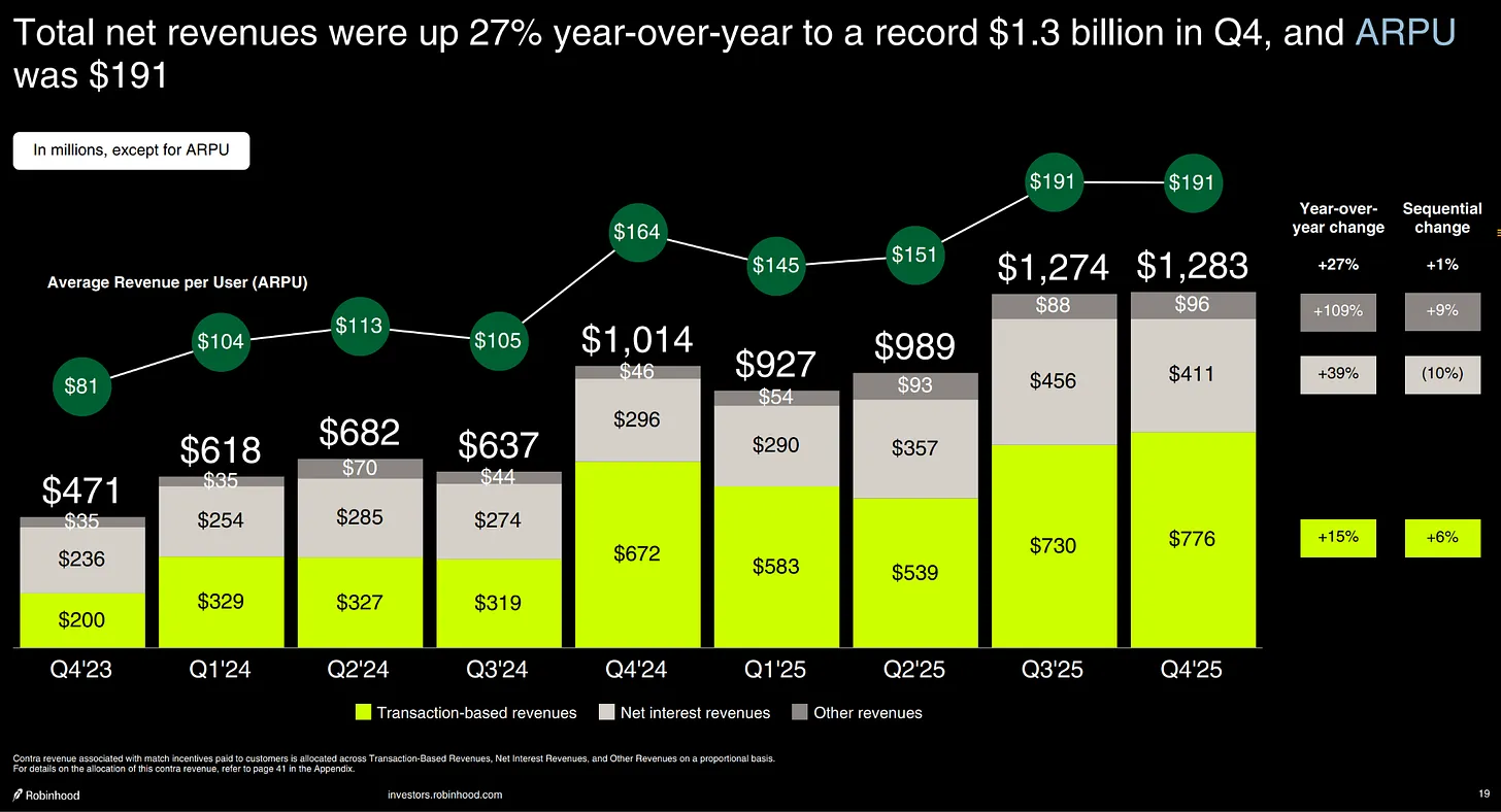 The most notable aspect is its average revenue per user (ARPU), which grew 27% year-over-year to $191, while paying users increased by only 7%. This indicates Robinhood is earning more from each customer without needing to rapidly expand its user base. Compared to its business model at IPO in 2021, this is a more diversified approach.