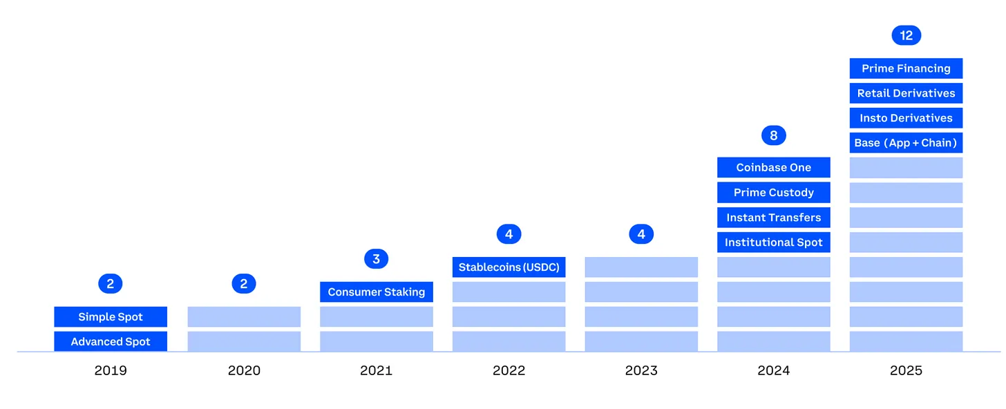 Coinbase is systematically diversifying across multiple business areas, reducing reliance on the crypto cycle, which should boost investor confidence. Currently, Coinbase has 12 business units generating over $100 million annually, with six exceeding $250 million, and two surpassing $1 billion.