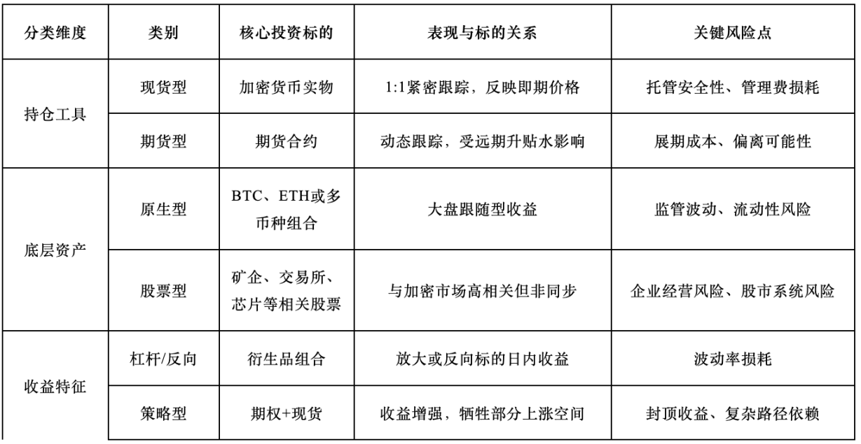 Besides holding tools, crypto ETFs can be classified by tracking object: single asset or index/basket; by underlying asset class: crypto assets or industry stocks. Leveraged, inverse, and other strategy-based products involve more complex mechanisms, often with daily resets and path dependency, suitable for narrower investor groups.