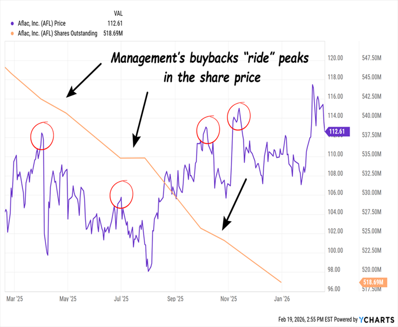 Here we see that in 2025, Aflac spent about $4.8 billion on dividends and buybacks, with a lean toward buybacks. (Which is okay by us, given the stock’s strong performance.)