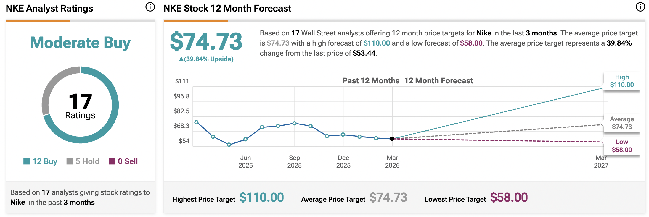 Turning to TipRanks, Wall Street has a Moderate Buy consensus rating on Nike stock (NKE) based on 12 Buy and five Hold recommendations. The average 12-month NKE stock price target of $74.73 indicates 39.84% upside potential.