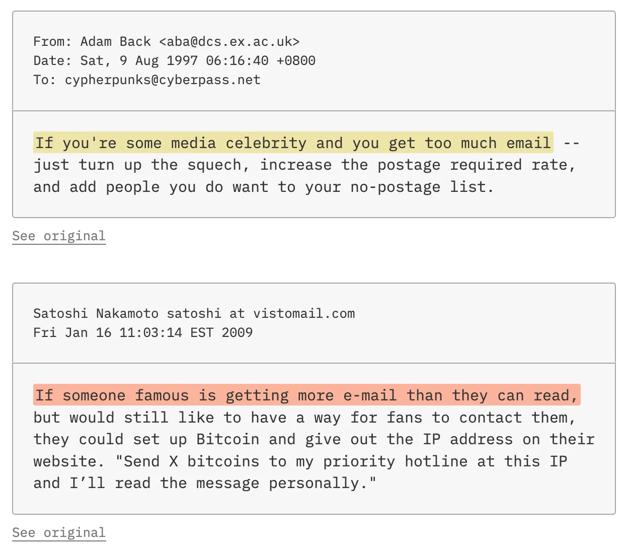 For example, both used two spaces between sentences—an editorial typography habit indicating an author from an older generation. Nakamoto and Back also used the interjection bloody (typical of the British)