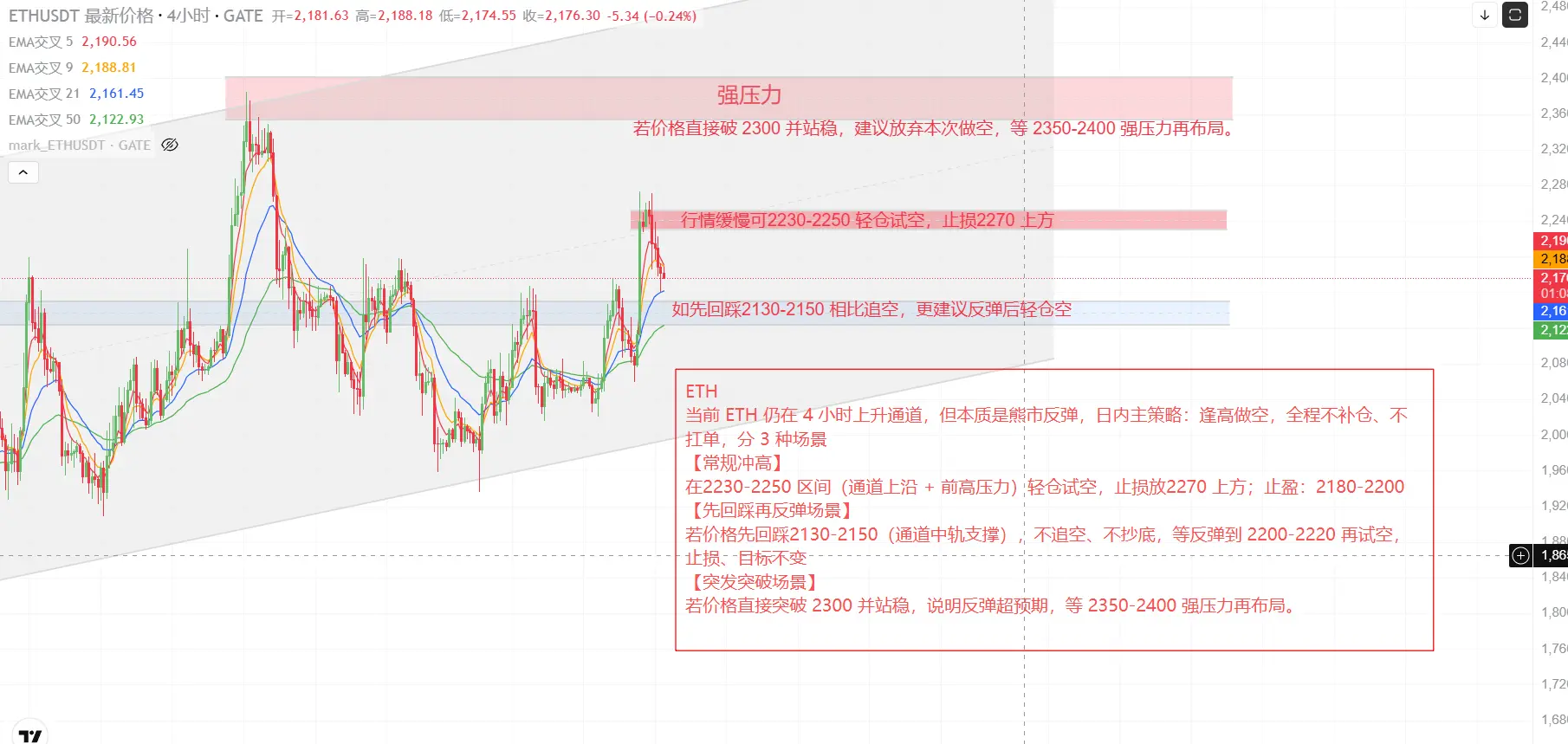 ETH Current ETH is still in a 4-hour rising channel, but fundamentally it’s a bear-market rally. Intraday main strategy: short at higher prices, in 3 scenarios. 【Normal spike up】 In the 2230-2250 range (upper band of the channel + resistance from the prior high), try a small short position; stop loss above 2270; take profit at 2180-2200. 【Pullback then rebound scenario】 If price first pulls back to 2130-2150 (channel midline support), don’t chase the short and don’t buy the dip. Wait for a rebound to 2200-2220, then try the short. Stop loss and targets remain unchanged. 【Sudden breakout scenario】 If price directly breaks above 2300 and holds, that indicates the rally is beyond expectations. Wait for strong resistance between 2350-2400 to set up.