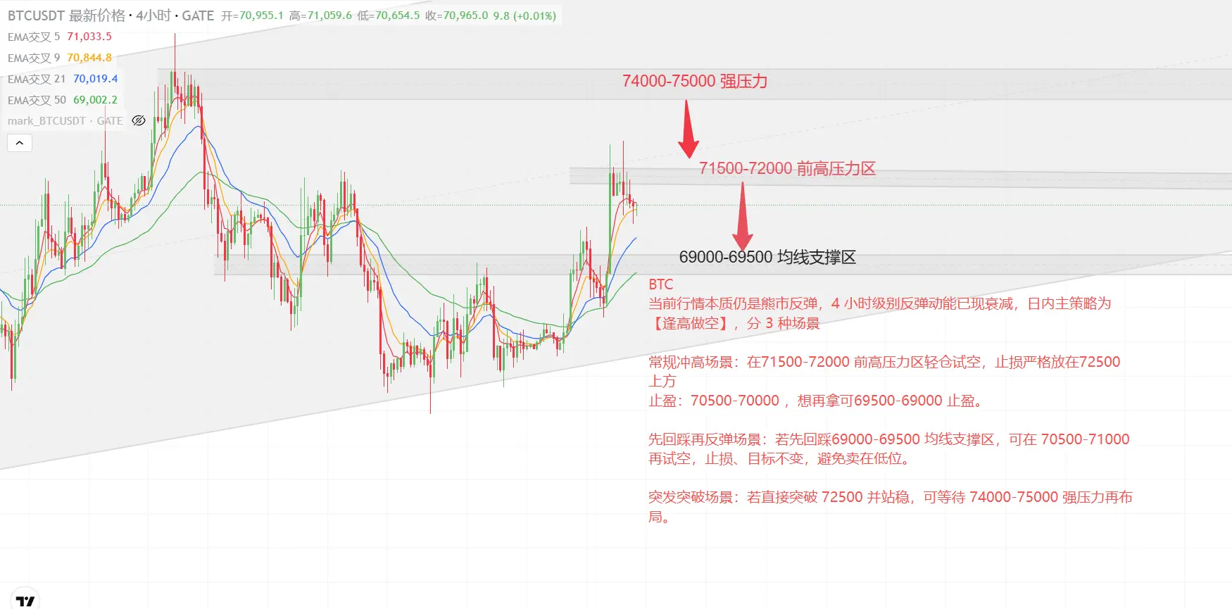 Pullback-then-rally scenario: If price first pulls back to the 69,000-69,500 moving-average support zone, you can try another short at 70,500-71,000. Stop-loss and target remain unchanged, so as to avoid selling at a low level.