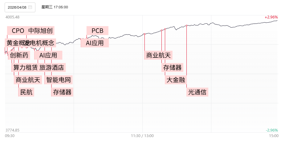 Cailian Press, April 8 — Today, 123 stocks hit the daily limit, 17 stocks hit the limit-up halt, with an overall limit-up rate of 88%. Huiruan Communication hit four consecutive limit-ups, Zhong’an Technology three, Minohua achieved 7 limit-ups in 13 days, Xinzhonggang 5 in 6 days, Shenjian Shares 5 in 9 days, China International Construction 3 in 4 days, Jiuzhou One Track 20cm 2 in 3 days. The market rebounded collectively, with the Shanghai Composite Index rising by hundreds of points, the ChiNext Index up nearly 6%, and the STAR Market 50 Index up over 6%. Trading volume significantly increased, with the combined turnover of the Shanghai and Shenzhen markets reaching 2.43 trillion yuan, an increase of 820.1 billion yuan compared to the previous trading day. On the sector front, hot spots rotated rapidly, with over 5,100 stocks rising across the market, and more than 100 stocks hitting the limit-up for two consecutive days. In terms of sectors, precious metals, AI applications, computing power leasing, and hardware related to computing power led the gains; oil and gas, coal sectors weakened against the trend. By the close, the Shanghai Composite rose 2.7%, Shenzhen Component Index up 4.79%, and the ChiNext Index up 5.91%.