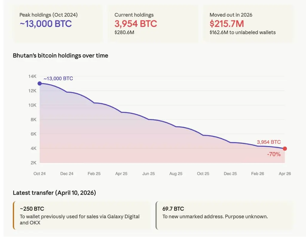 But the turning point began to become visible in the second half of 2024. In October 2024, Bhutan’s holdings reached a peak of about 13,000 BTC, after which it entered a gradual divestment channel. In November 2024, Bhutan received its last mining reward from the Foundry USA mining pool address—about 0.9 BTC (worth about $75,730 at the time). After that, no large on-chain inflows of mining rewards were recorded. In September 2025, Bhutan focused on selling off about 3,500 BTC, accelerating the pace of divestment. From March to April 2026, the frequency and scale of transfers further increased, and holdings fell below 4,000 BTC.