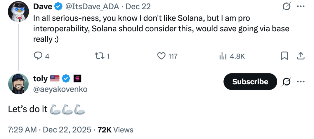 Na semana passada, a Cardano habilitou atomic swaps entre BTC e ADA via Fluid—não por meio de pontes cross-chain, tokens embrulhados ou custódia centralizada, mas por transações diretas script-to-script no nível de protocolo. Isso é possível, em parte, porque a Cardano utiliza o modelo UTXO. Dois dias atrás, operadores de pools de staking da Cardano interagiram com cofundadores da Solana no X, reforçando essa direção.