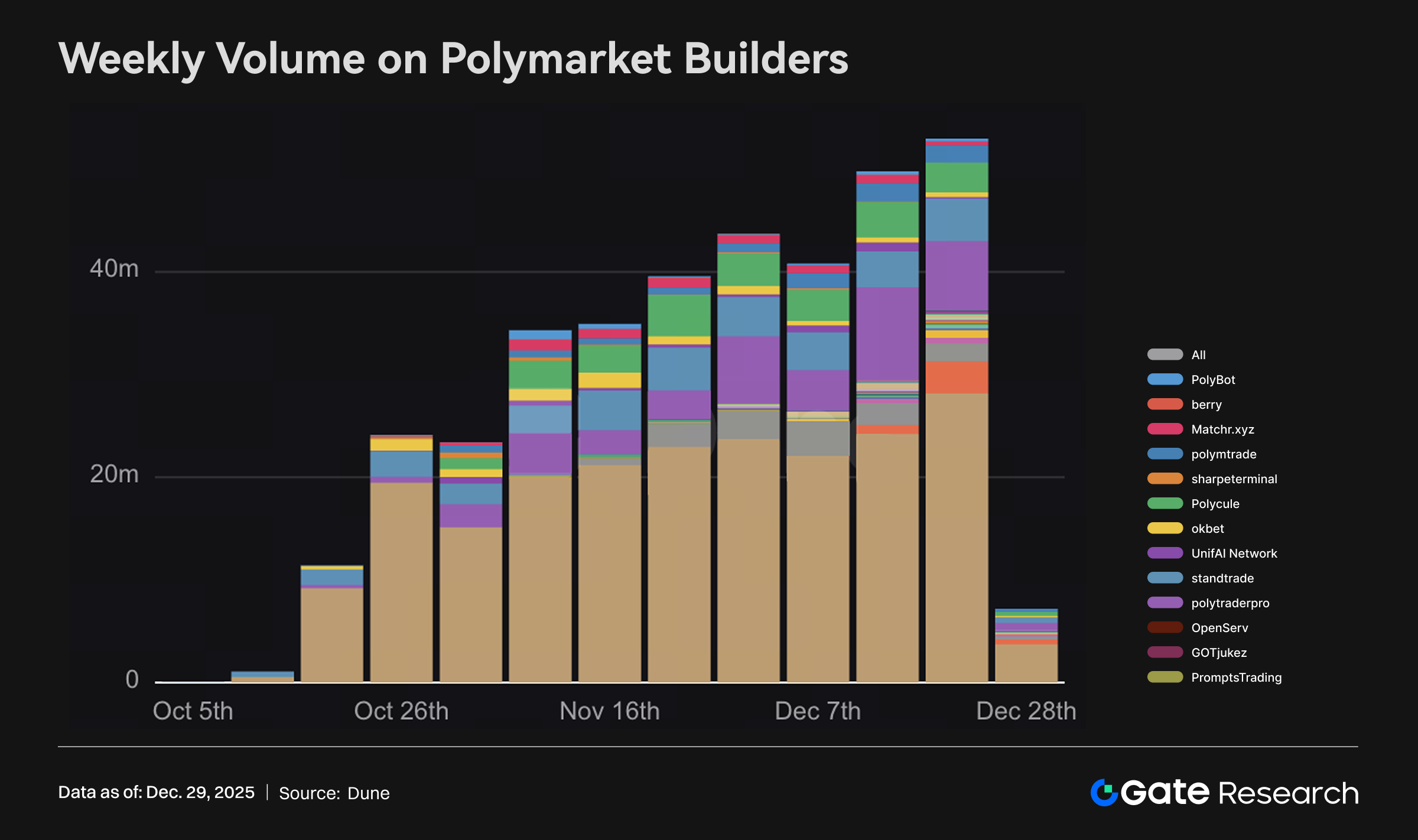 Estruturalmente, começa a se formar uma diferenciação interna entre os Builders. betmoar lidera com quase metade do volume. Enquanto isso, PolyTraderPro, Stand Trade e Polycule compõem o “segundo escalão”, formando um cenário com topo concentrado e segmento intermediário dinâmico.