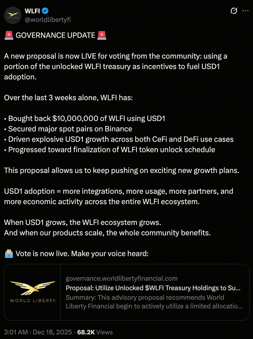Em 18 de dezembro, a WLFI comunicou oficialmente via plataforma X que sua equipe submeteu uma nova proposta de governança para votação da comunidade. O objetivo principal é utilizar parte dos fundos desbloqueados do tesouro WLFI como incentivos para acelerar a adoção de mercado e a aplicação prática do USD1.