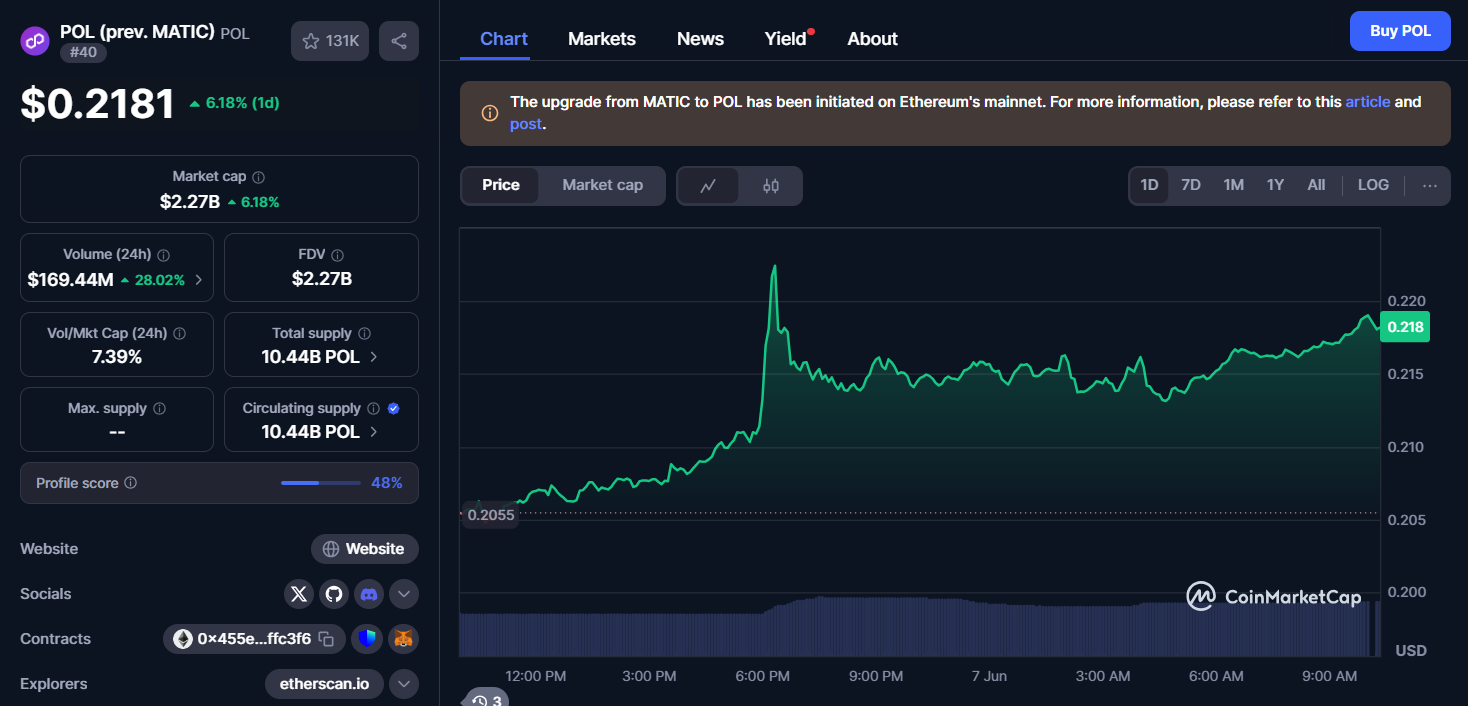 POL (prev. MATIC), anteriormente conhecido como MATIC, é uma criptomoeda e plataforma de blockchain projetada para melhorar a escalabilidade e a velocidade das transações do Ethereum. Nas últimas 24 horas, o ativo digital POL registrou movimento positivo em sua ação de mercado, registrando um aumento de 6,17% em relação à faixa de negociação de ontem.