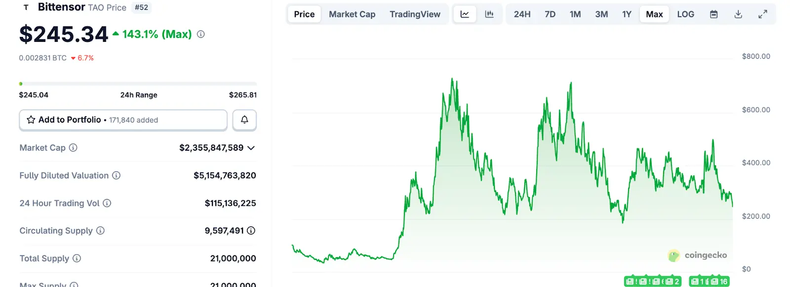 O Bittensor possui algumas características semelhantes ao Bitcoin. Existem apenas 21 milhões de unidades de TAO, claramente uma referência ao BTC. O Bittensor também tem halving, que em dezembro reduziu suas recompensas de 7.200 TAO para 3.600 por dia.