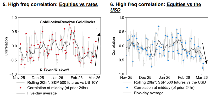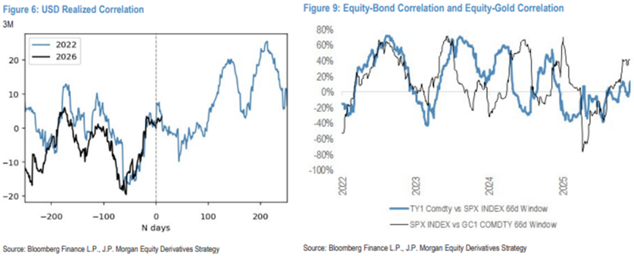 Ao mesmo tempo, o mercado voltou a reproduzir o cenário do início do conflito Rússia-Ucrânia em 2022, com ativos de risco e de refúgio sendo vendidos simultaneamente. O dólar continua a fortalecer-se, enquanto ouro, títulos do Tesouro dos EUA e franco suíço enfraquecem, com as expectativas de cortes de juros do Federal Reserve claramente se ajustando, reavaliando uma trajetória de juros mais alta e prolongada, apresentando uma estrutura semelhante à “menina de ouro” invertida de 2022. Quando a estrutura do mercado sofre uma mudança radical, a correlação entre ativos também se inverte. Dentro dos ativos de refúgio, há uma reordenação de níveis: o dólar substitui o ouro como principal ativo de proteção, com os fundos fluindo prioritariamente para o sistema do dólar em momentos de maior incerteza, ao invés de alocar ouro sem rendimento; recentemente, a correlação entre títulos do Tesouro dos EUA e ações voltou a ser positiva, e os títulos também não têm desempenhado papel de refúgio.