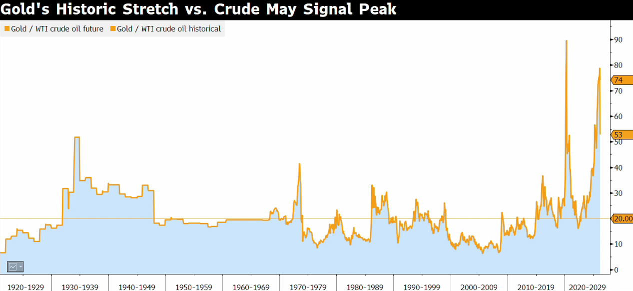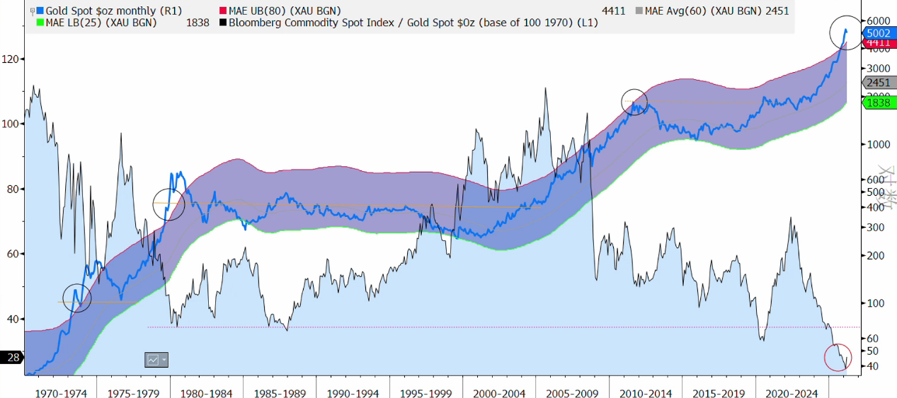 Além disso, antes do conflito, o ouro já tinha passado por uma forte alta de mercado, com negociações extremamente congestionadas, e uma valorização significativamente acima da média de longo prazo, com pouca energia de compra marginal. Até o final de fevereiro, o prêmio do ouro em relação à sua média móvel de 60 meses atingiu o nível mais alto desde 1980. As posições longas em CTA de ouro também estavam altamente concentradas, com posições especulativas de compra muito próximas do limite. A relação ouro/preço do petróleo também atingiu níveis históricos elevados. Com uma avaliação extremamente esticada e uma concentração de posições, qualquer realização de lucros ou aperto de liquidez pode desencadear uma onda de vendas de posições longas. Se o preço do ouro continuar a subir para 6000 dólares, será necessário um suporte baseado em padrões inflacionários dos anos 1970 ou eventos geopolíticos extremos.