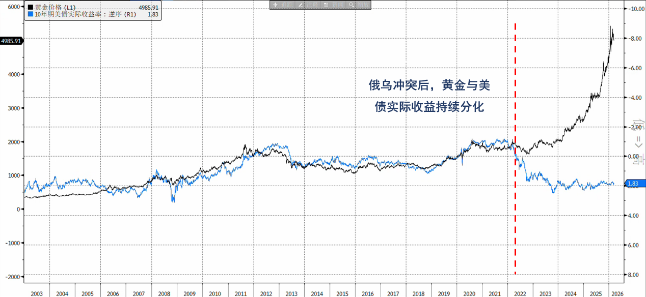 O aumento anterior do ouro refletia principalmente a intensificação da tendência de desdolarização. Após o conflito Rússia-Ucrânia, EUA e Europa intensificaram sanções à Rússia, e os bancos centrais globais passaram a ver o ouro como garantia neutra, independente da credibilidade de qualquer governo, aumentando suas reservas estratégicas para se protegerem contra a “armadilha” do dólar. Posteriormente, o movimento do ouro divergiu significativamente da trajetória das taxas de juros reais. Com o arrefecimento temporário do discurso de aumento de reservas estratégicas, o ouro voltou ao seu modelo tradicional de precificação de refúgio, com as taxas de juros reais voltando a ser uma variável-chave na determinação do preço do ouro.