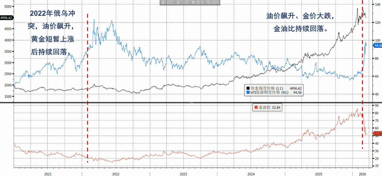À medida que a situação no Médio Oriente se intensifica, o Brent mantém-se acima de 100 dólares por barril. Segundo a experiência tradicional, conflitos geopolíticos tendem a impulsionar o prémio de risco do ouro. No entanto, nesta rodada de conflito, o ouro mostrou-se claramente mais inerte, sem desempenhar plenamente a sua função de proteção. Diante dos riscos geopolíticos contínuos entre EUA e Irã, o ouro sofreu uma grande retração no início do conflito: em 3 de março, caiu 4,38%, rompendo a barreira de 5000 dólares por onça, atingindo a maior queda diária desde janeiro de 2026; até 18 de março, o preço do ouro caiu mais de 6% em relação ao início do conflito, atualmente estabilizado em torno de 5000 dólares por onça; a relação ouro/petróleo também recuou de níveis elevados temporários.