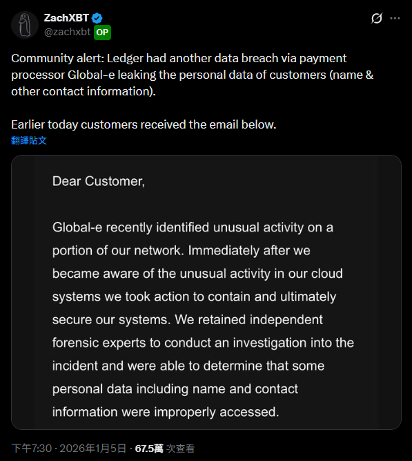 Fonte: X Investigador de blockchain ZachXBT revelou que o parceiro de processamento de pagamentos de terceiros da Ledger, Global-e, sofreu uma fuga de dados, levando ao acesso não autorizado a informações pessoais de alguns utilizadores.