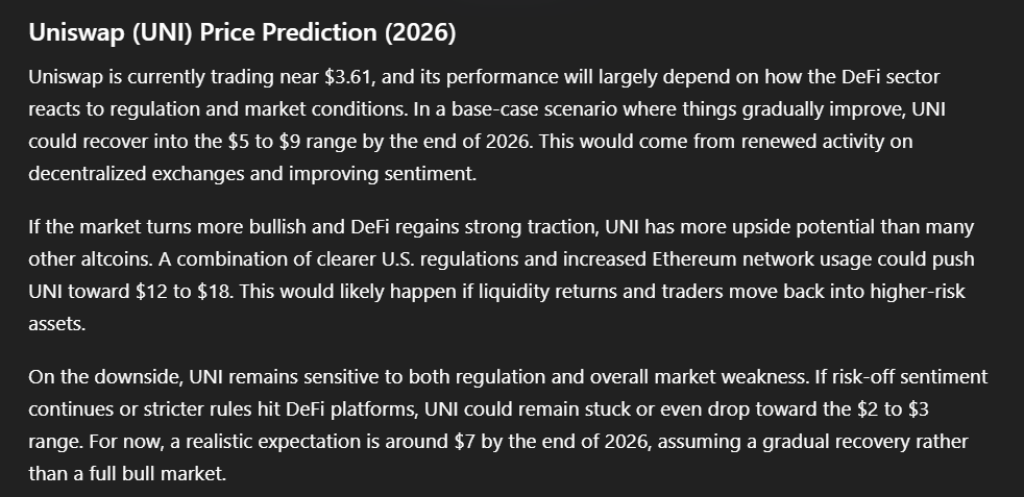 Para uma visão mais ampla, o UNI depende muito do DeFi. Se a atividade voltar e as pessoas começarem a usar novamente as exchanges descentralizadas, o preço pode subir. Nesse caso, fazer parte da faixa de $5 a $9 até ao final de 2026 faria sentido.