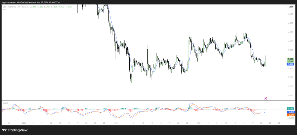 O Uniswap parece um pouco mais interessante, mas ainda não está fora de perigo. Está a cerca de $3,61. Embora a tendência geral tenha sido de baixa, parece estar a tentar consolidar-se.