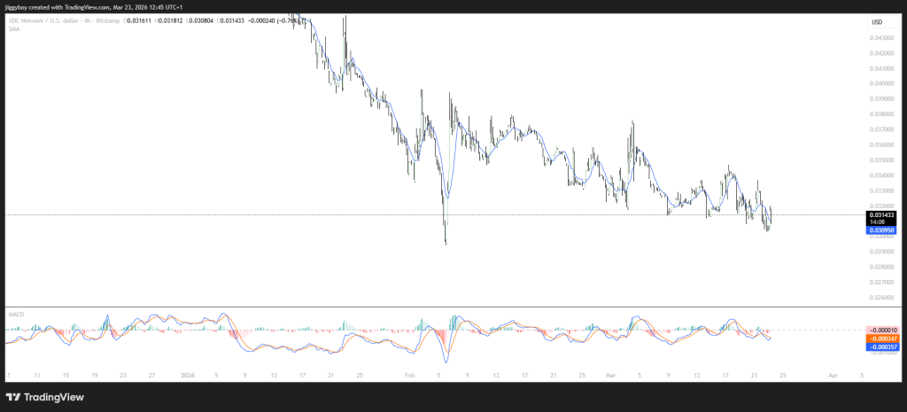 O XDC está agora simplesmente… quieto. Está a rondar os $0,031, e o gráfico mostra uma perda lenta, em vez de uma queda abrupta. Tem feito máximos mais baixos há algum tempo, o que geralmente significa que os compradores ainda não estão a entrar com convicção.