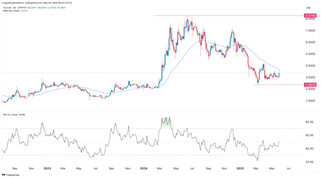 Дневной график показывает, что цена TON достигла минимума в $2.3675 в апреле, а затем вернулась к $3.37 сегодня. Тем не менее, она остается ниже 50-дневной экспоненциальной скользящей средней (EMA), которая оказывает на нее значительное сопротивление.