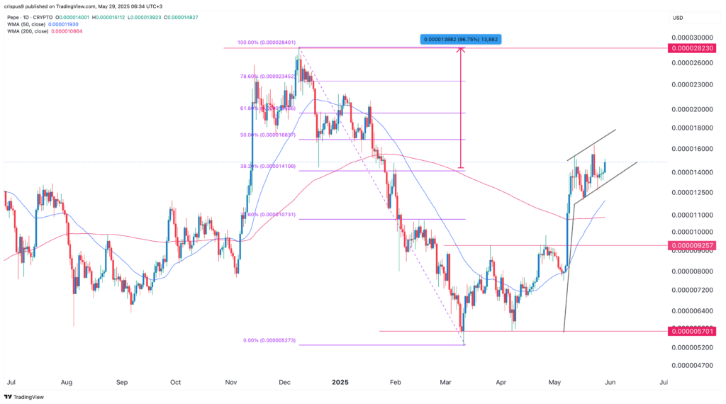 Цена токена Pepe Coin сформировала паттерн золотого креста, когда 50-дневные и 200-дневные взвешенные скользящие средние (WMA) пересеклись. Золотой крест является одним из самых бычьих графических паттернов в техническом анализе.