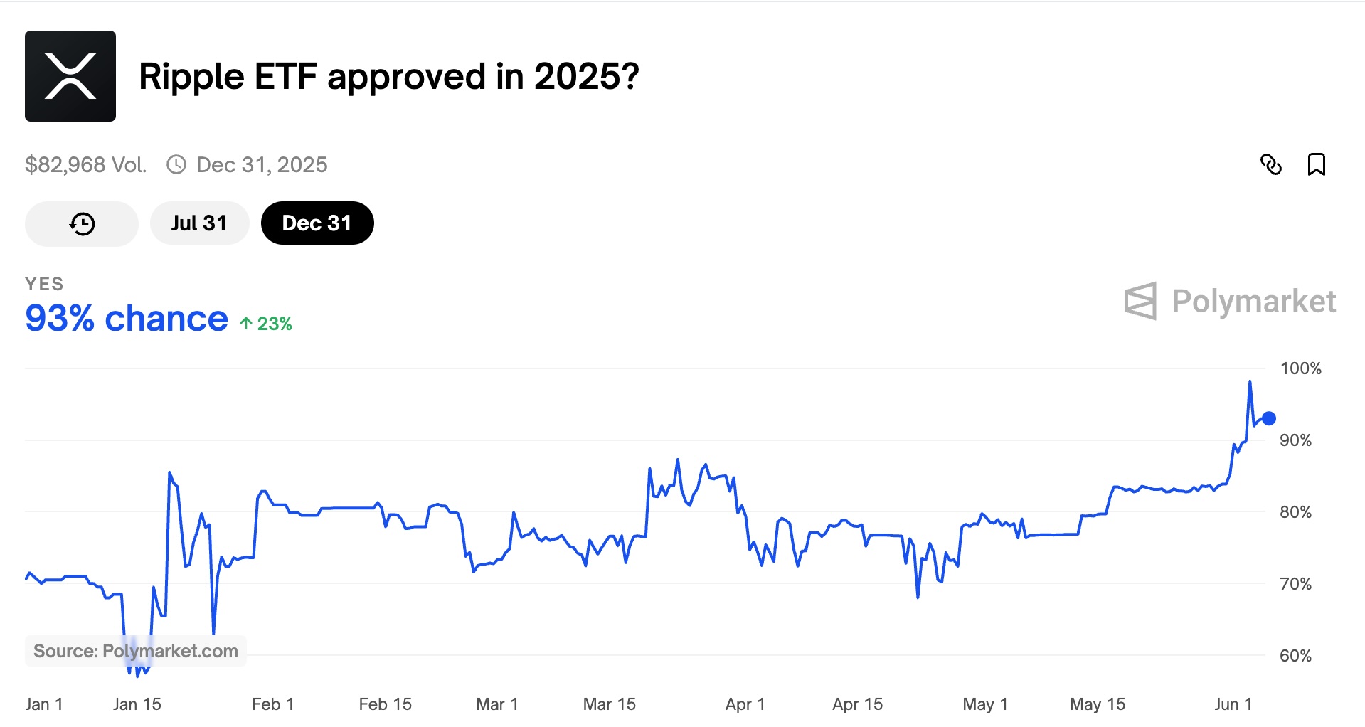 Вероятность того, что Комиссия по ценным бумагам и биржам США (SEC) одобрит фонд, торгуемый на бирже XRP (ETF), достигла огромных 98% 3 июня, согласно децентрализованной платформе прогнозов Polymarket.