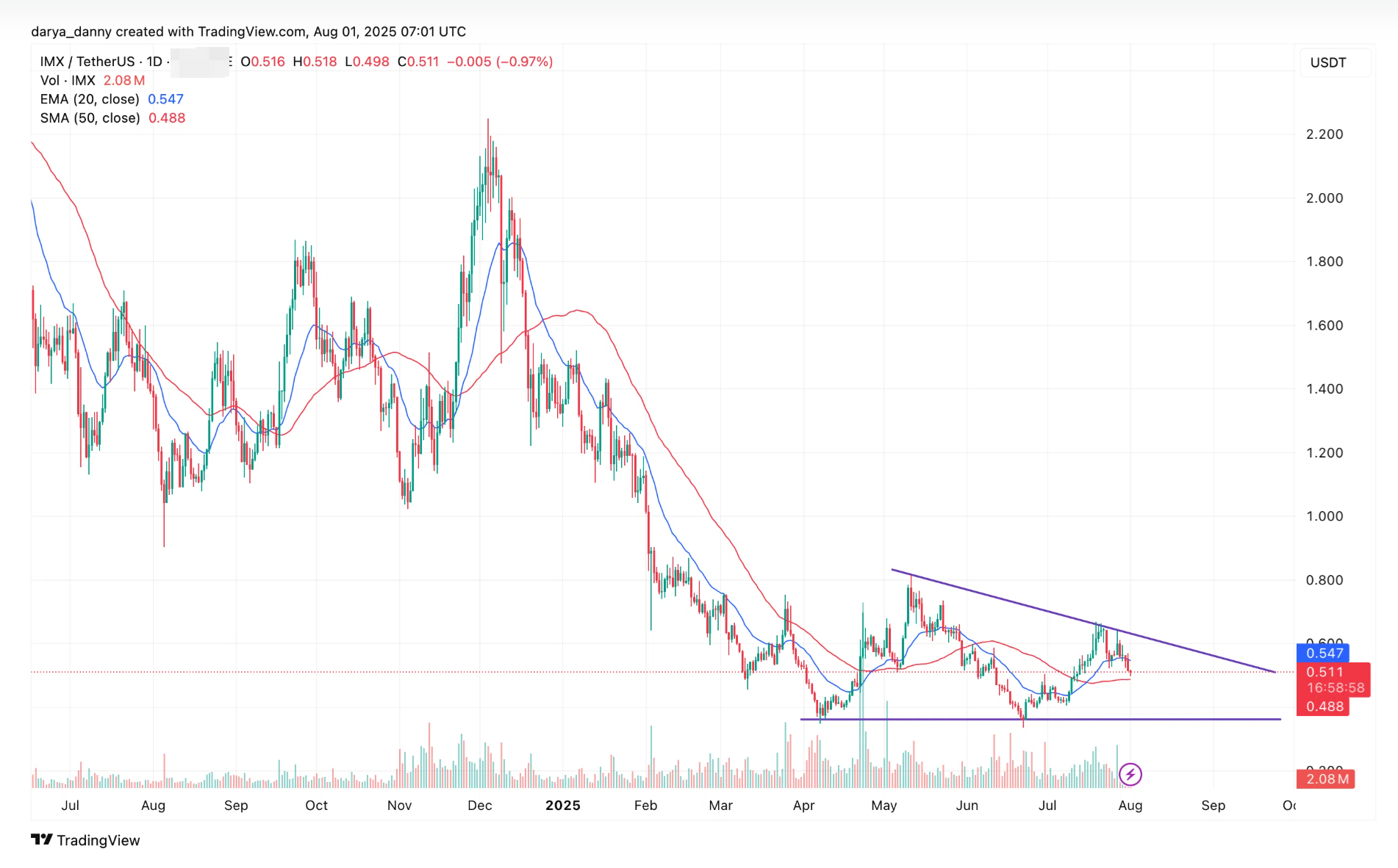 Цена IMX с 19 июля, когда она достигла максимума в 0,67 доллара, продолжает падение, в настоящее время торгуется около 0,51 доллара, что на около 25% откат от пика. Ключевые технические сигналы включают: